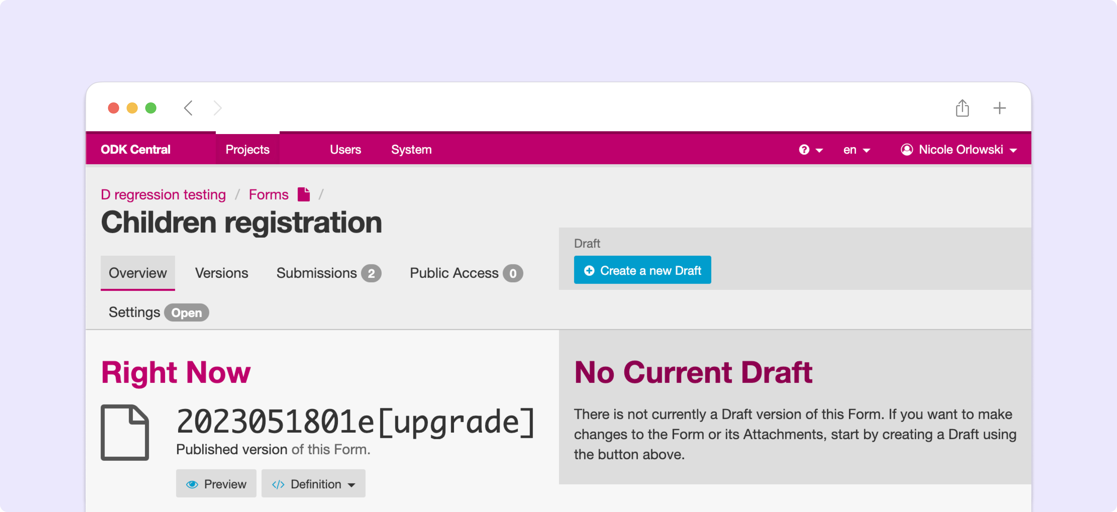 Form Drafts provide a way to safely and easily verify the design of your Form before you make it available for use. Drafts are accessible only to privileged Project staff. Each Form Draft has a unique access token so you can configure Collect and send test submissions to the Draft. These test submissions disappear automatically when the Draft is published. Once a Draft is published, it is available for use according to the access rules you have specified in the Form Access tab on the Project.